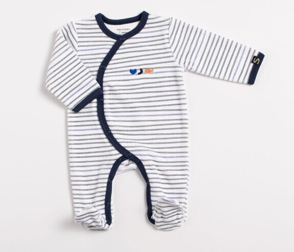 A la naissance, il est essentiel de maintenir bébé au chaud. Les pyjamas Sauthon en bouclette velours et ouverture sur le côté préservent le confort et la chaleur des tout-petits. Le pyjama Baby Sailor taille naissance vous séduira grâce à ses rayures légères dans le style marinière et ses couleurs bord de mer.