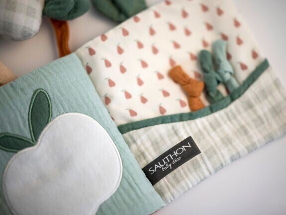 LIVRE D'EVEIL BOTANICA :Sauthon a imaginé le premier livre de bébé aux couleurs du thème Botanica. En tissu et composé de multiples activités sensorielles et auditives, le livre d'éveil Botanica amusera bébé lors de ses moments d'éveil.