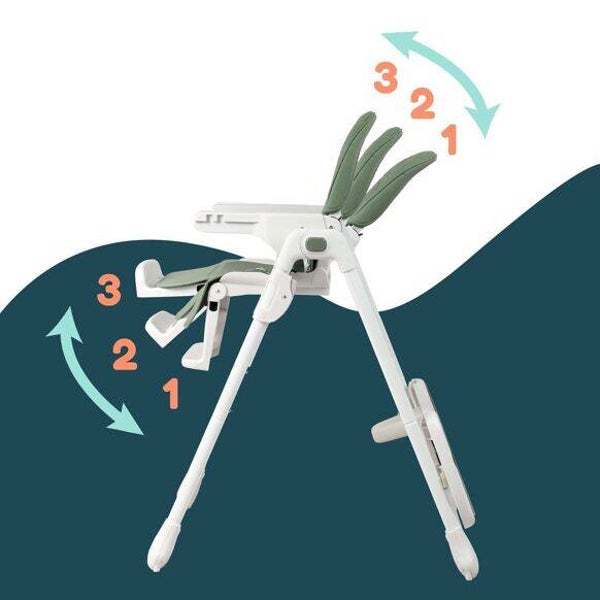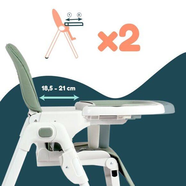 - Dossier et repose jambe inclinables 3 positions pour un petit repos après le repas avec une tablette amovible et réglable en profondeur (2 positions) pour s'adapter à l'âge du bébé