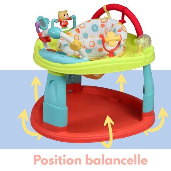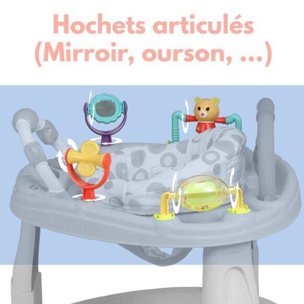 La position rotative à 360° permet à l’enfant d'interagir avec le monde qui l'entoure et d’avoir toutes les activités de la base d’activité et d’éveil à portée de main. Toutes les activités proposées émerveillent bébé e t lui permettent de développer sa motricité fine en touchant et attrapant les objets de la base et sa motricité globale en lui laissant la possibilité de bouger dans la base!
