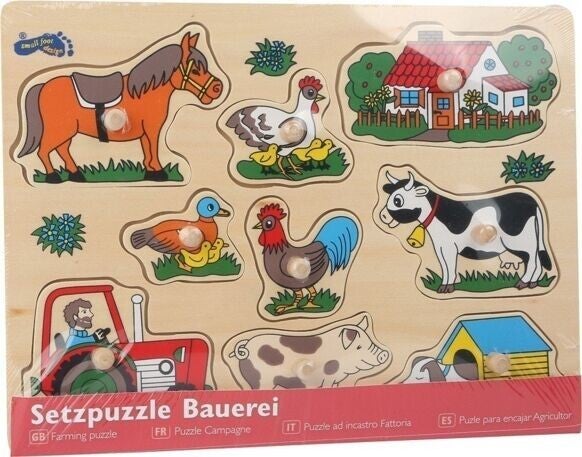 Le puzzle en bois contient au total neuf personnages d'une ferme, qui peuvent être facilement saisis par les poignées en bois. Les pièces du puzzle se composent d'un cheval, d'une poule, d'une ferme, d'un canard, d'un coq, d'une vache, d'un tracteur, d'un cochon et d'un chenil.