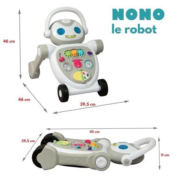 Nono le robot est un trotteur-marcheur que bébé doit pousser pour avancer. Il peut aussi s'utiliser à plat en repliant les roues sur le coté et donc bébé peut jouer avec même lorsqu'il n'a pas envie de marcher.