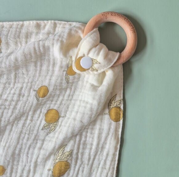 Doudou avec anneau de dentition en bois de hêtre. Tissu hydrophile doux avec anneau de dentition en bois. un joli doudou pour se blottir dans des tons doux et neutres ! Les lingettes mesurent environ 30x30 cm avec un bouton pression. Le lavage peut être effectué à 30 degrés Celsius. (Retirez l'anneau en bois au préalable)