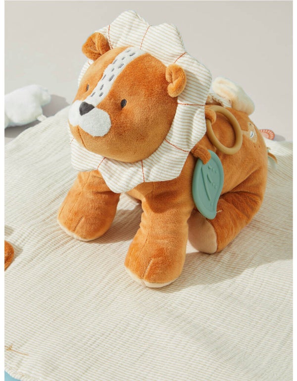 Babou le gentil lion offre de nombreuses activités : hochet aux billes multicolores, un miroir, des jouets de dentition pour soulager les poussées dentaires, du papier froissé, un carillon à l'intérieur et des étiquettes colorées.