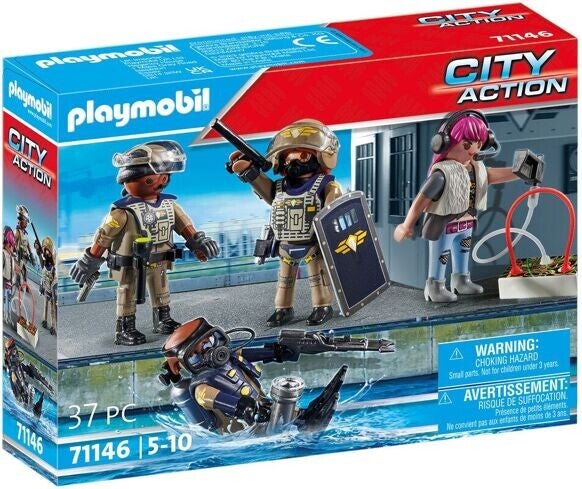Contient 4 personnages, les casques des agents spéciaux sont amovibles. Les ceinturons autour de la taille des personnages permettent d'y accrocher des accessoires
