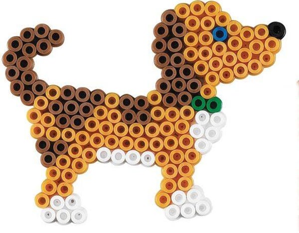 L'enfant pose les perles de différentes couleurs sur une plaque à picot et crée son motif suivant son inspiration ou s'aidant des livres idées.