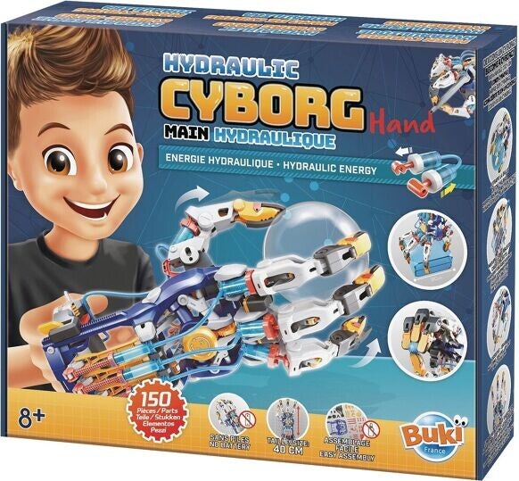 Main hydraulique : construis une main cyborg articulée en assemblant les pièces. Ajoute de l'eau dans le système et pilote-la du bout des doigts. Elle s'ajuste et peut porter des balles ou des bouteilles.