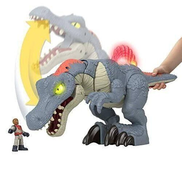 - Les enfants peuvent créer leurs propres aventures autour de l’univers Jurassic World avec ce grand dinosaure Spinosaurus (20 cm de long) qui attaque à coups de dents et est fourni avec une figurine d’humain