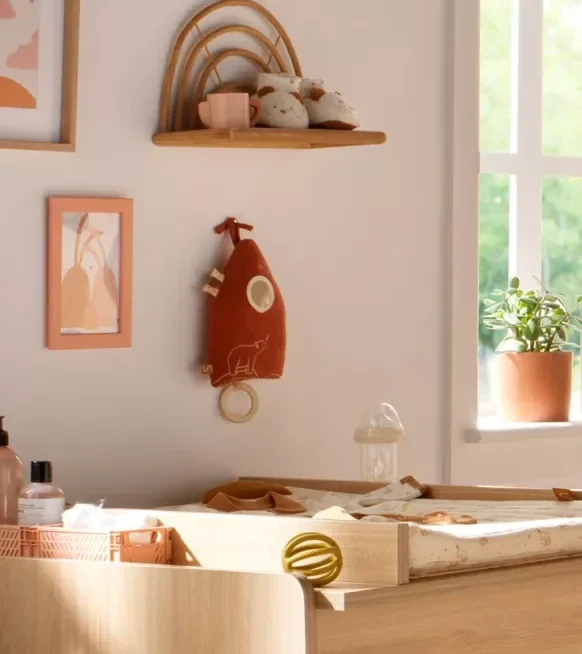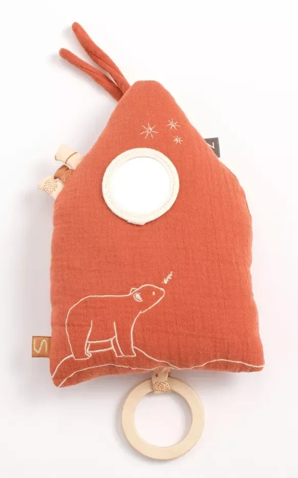 Découvrez la maison musicale en double gaze de coton terracotta, si douce et craquante, de la collection Orsino. Avec son lien, elle s'accroche aussi bien aux barreaux du lit qu'au montant de la poussette afin de bercer bébé de sa douce musique.