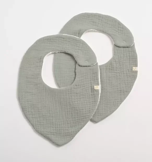 Pour les premiers repas de bébé, Sauthon a décliné un lot de deux bavoirs en double gaze de coton, couleur sauge.