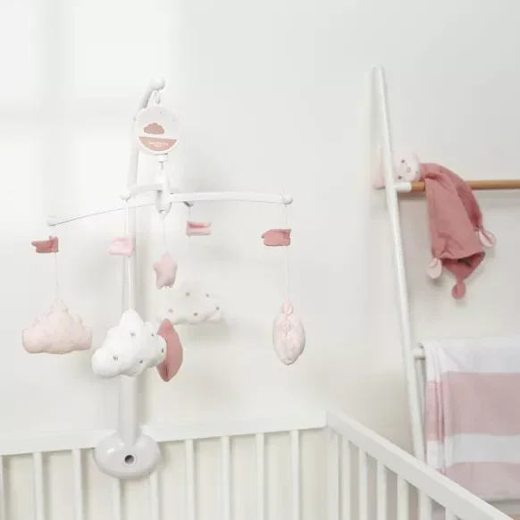 Le mobile SAUTHON Lily Poudrée est destiné à stimuler l'ouie et à éveiller bébé avec ses nuages suspendus. Objet de décoration en lui-même, il s'inserrera parfaitement dans une chambre avec une décoration sobre et douce .