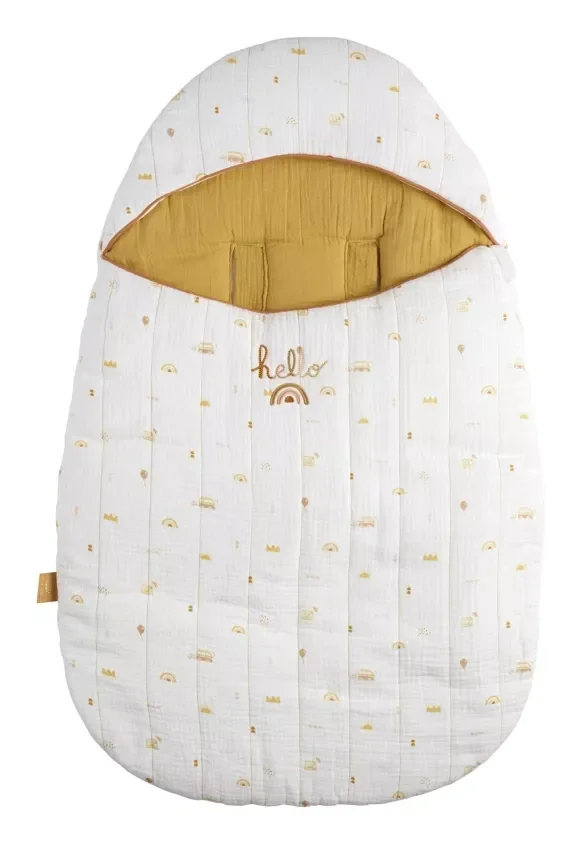 Pour accompagner bébé dès la sortie de la maternité, Sauthon a imaginé ce nid d'ange Sunlight avec sa jolie couleur écrue et sa broderie Hello.
