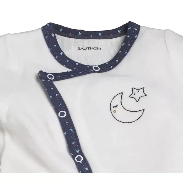 A la naissance, il est essentiel de maintenir bébé au chaud. Les pyjamas Sauthon en bouclette velours et ouverture Y préservent le confort et la chaleur des tout-petits. Déclinés en blanc neige ou en bleu indigo tonique, pour s'associer parfaitement aux bodies et à la gigoteuse Merlin : le pyjama velours blanc est associé à un colletage en all-over étoilé indigo. On retrouve cet imprimé sur le bout des manches et sous les pieds. Broderie Merlin en signature sur la poitrine. Ouverture Y originale: l'ouverture se fait de biais pour un détail plus mode.