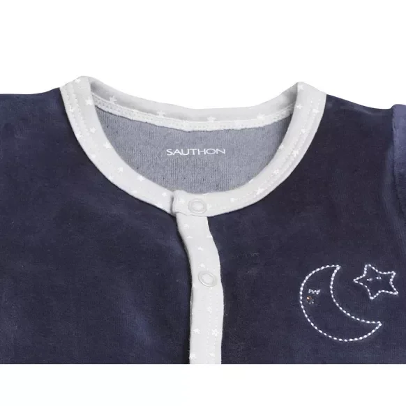 A la naissance, il est essentiel de maintenir bébé au chaud. Les pyjamas Sauthon en bouclette velours et ouverture Y préservent le confort et la chaleur des tout-petits. Déclinés en blanc neige ou en bleu indigo tonique, pour s'associer parfaitement aux bodies et à la gigoteuse Merlin : Un pyjama velours bleu indigo très tendance associé à un colletage en jersey gris perle. Une broderie sur la poitrine de la lune signe le pyjama. Ouverture Y classique. Colletage des manches et dessous des pieds en jersey imprimé gris perle