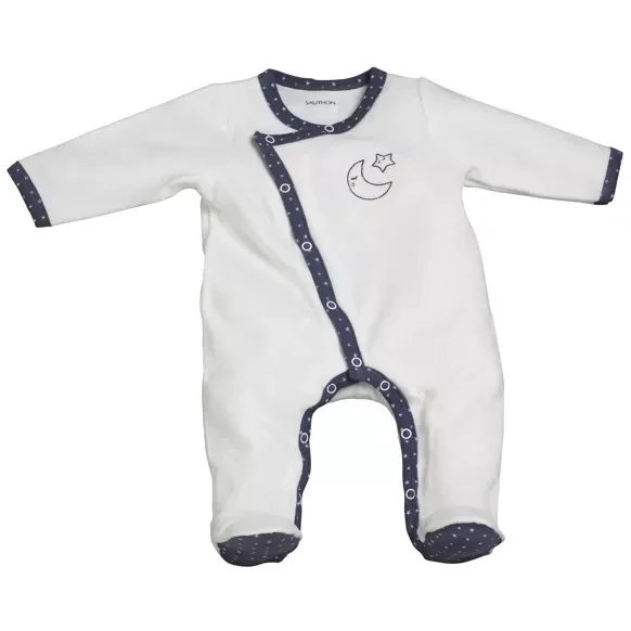 A la naissance, il est essentiel de maintenir bébé au chaud. Les pyjamas Sauthon en bouclette velours et ouverture Y préservent le confort et la chaleur des tout-petits. Déclinés en blanc neige ou en bleu indigo tonique, pour s'associer parfaitement aux bodies et à la gigoteuse Merlin : le pyjama velours blanc est associé à un colletage en all-over étoilé indigo. On retrouve cet imprimé sur le bout des manches et sous les pieds. Broderie Merlin en signature sur la poitrine. Ouverture Y originale: l'ouverture se fait de biais pour un détail plus mode.