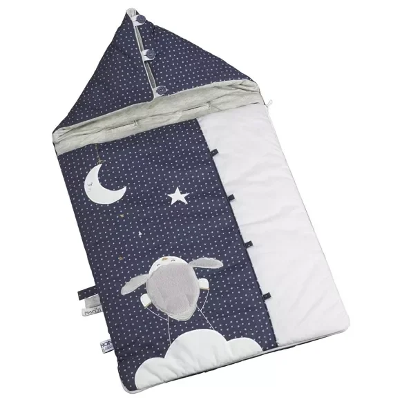 Pour accompagner bébé dans ses sorties, Sauthon a imaginé ce nid d'ange dans un univers coloré où le bleu indigo allié au gris perle diffusent douceur et sérénité.