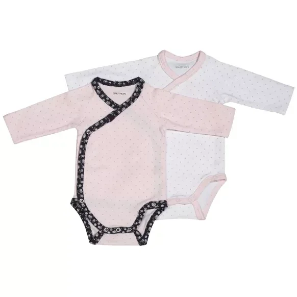 Les bodies Sauthon sont vendus par lot de 2 pour permettre aux parents de changer bébé plusieurs fois dans la journée. Leur forme croisée est très pratique et recommandée jusqu'au trois mois de l'enfant afin de faciliter l'habillage et le déshabillage. Le lot se compose de deux bodies très féminins: un body all-over blanc à pois rose et colletage contrasté rose et un body all-over rose à pois avec colletage contrasté en imprimé fleuri.