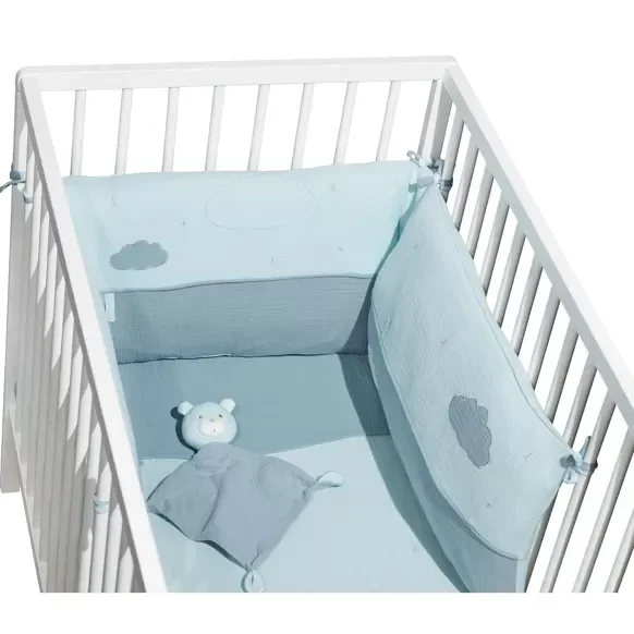 Ce tour de lit déhoussable Lily Mint, s'adapte au lit 120x60 ou 140x70.La gamme Lily de Sauthon se décline en 3 couleurs. Vous serez séduit par la douceur de la mousseline de coton gaufré, la finesse des broderies et la sobriété du dessin pour créer un tour de lit qui apportera une touche bohème chic à la chambre de votre enfant.