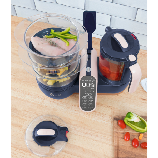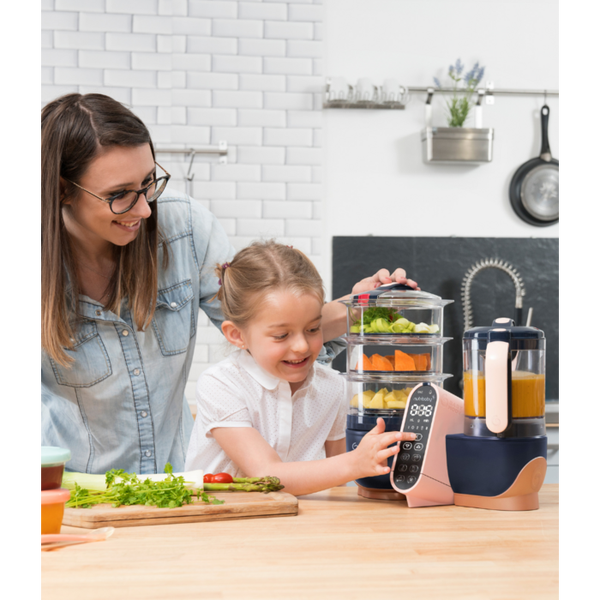 Grande capacité de cuisson : pour préparer tous les repas de la semaine ! Le robot culinaire pour bébé Nutribaby XL vous permet de préparer des repas faits maison complets et équilibrés en grande quantité grâce à ses trois paniers de cuisson séparés et son grand bol de mixage. Idéal pour la diversification alimentaire : préparez en toute simplicité légumes, viandes, poissons, pates, riz et même céréales dans votre Nutribaby XL. Ses 3 paniers séparés permettent de cuire au juste temps chaque aliment et préserver ainsi leurs saveurs et nutriments pour faire découvrir à votre bébé un maximum de goûts tout en lui apportant les vitamines dont il a besoin. Ajustez la texture avec les 3 vitesses de mixage et donnez encore plus de goût et de vitamines avec le jus de cuisson conservé dans son récupérateur indépendant, situé sous les paniers. La cuisson vapeur préserve mieux les qualités nutritionnelles des ingrédients cuisinés. C’est le cas du Fer par exemple, indispensable à la bonne croissance de bébé. La cuisson séparée des aliments préserve mieux les vitamines naturellement présentes dans les ingrédients cuisinés, comme la Vitamine C par exemple, qui aide à absorber le Fer.Vitamine C + Fer = défenses immunitaires boostées !Pour encore plus d'idées recettes bébé, rendez-vous sur notre blog et notre application Cuisine de Bébé. Vous trouverez plus de 400 idées recettes variées, classées par âge ou par aliment afin de vous donner les clés pour réussir au mieux la diversification alimentaire de votre bébé !