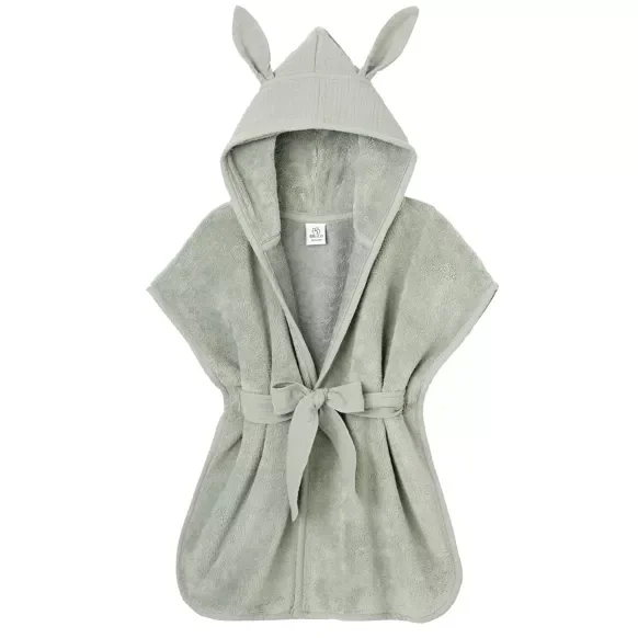 Un adorable peignoir en éponge bambou avec capuche et ceinture en double gaze de coton ton sur ton. Petites oreilles de lapin sur la capuche.
