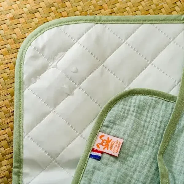 Le tapis à langer nomade a été conçu pour le change de bébé dans n’importe quel endroit. En balade ou chez des amis, Notre tapis est transportable et se glisse facilement dans le sac à langer. Une face est en double gaze de coton 100% biologique de couleur verte, et la face intérieure est en PVC imperméable pour éviter le risque de fuites.