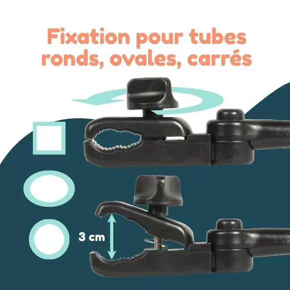 L'ombrelle est un accessoire indispensable pour prévenir des dangers d'une exposition prolongée au soleil tout en conservant une bonne ventilation. Le support de cette ombrelle se fixe à toutes formes de tubes de poussette, et l'ombrelle peut ensuite être retirée ou remise en place à volonté d'un simple clic. Les Atouts Ombrelle orientable diamètre 76cm avec sangle de fermeture pour un pliage compact Tissu anti-UV UPF50+ protège des rayons directs. Attention à la réverbération. Fixation sur tubes ronds, ovales, carrés ou rectangulaires 2 articulations pour une orientation adaptée Pied amovible à l'aide d'un simple clip, le pied reste sur la poussette quand on retire l'ombrelle L'avis des Pros "Le plus de cette ombrelle : le système de clic sur le support est très ingénieux qui permet d'enlever et remettre l'ombrelle très facilement" (Brigitte, assistante maternelle) Poids et Dimensions - Poids : 0.5 kg - Diamètre ouvert : 78 cm - Longueur : 76 cm Le tissu anti-UV protège des rayons directs mais attention à la réverbération: il est conseillé de toujours couvrir l'enfant le plus possible et d'utiliser des crèmes solaire à fort indice de protectionVoir moins