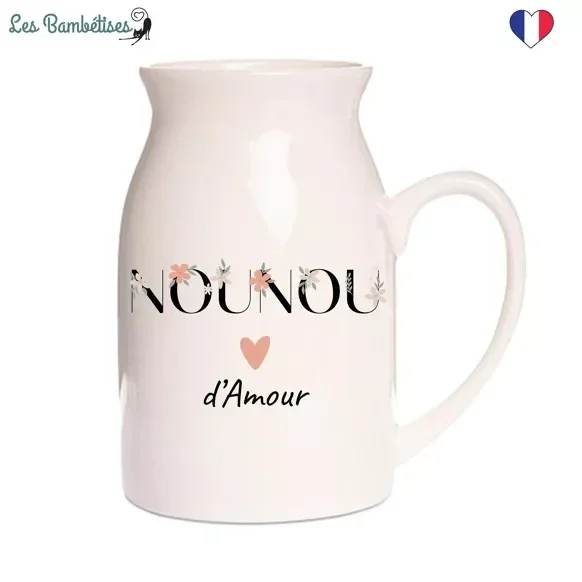 Pour les clients à la recherche du cadeau parfait pour une nounou, nous mettons en avant ce magnifique pot à lait, qui peut également être transformé en un charmant vase. Sur ce pot, le mot "NOUNOU" est inscrit en majuscules avec des lettres ornées de motifs floraux boho, présentant des nuances de roses claires et foncées, accompagnées de petites branches vertes pour une touche de fraîcheur. Juste en dessous, vous trouverez le mot "d’amour".