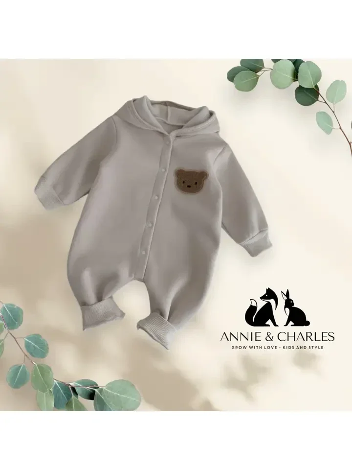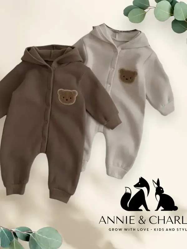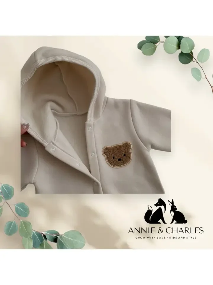 Combinaison pour bébé très mignonne et douce avec capuche et imprimé « teddy » disponible en deux couleurs différentes. Parfait pour le printemps, l'été, l'automne et l'hiver ! Matière : 95 % coton, 5 % élasthanne