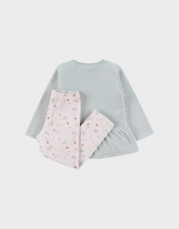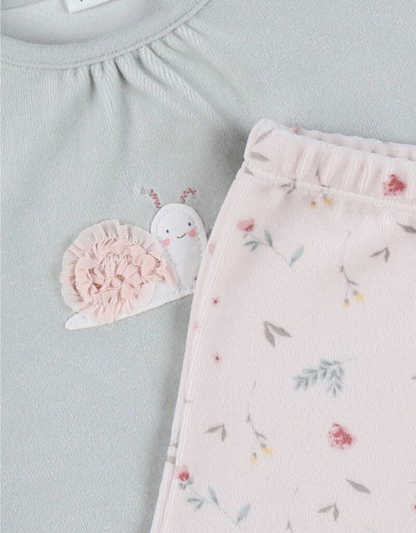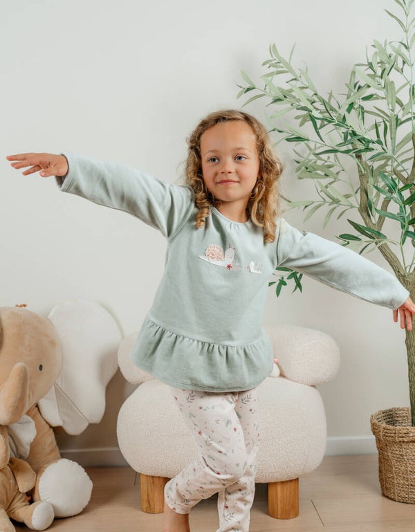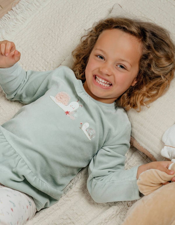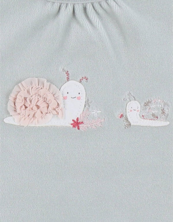 Ce pyjama en teinte eucalyptus est rehaussé d’une broderie d’escargots pleine de fantaisie, qui plaira à coup sûr aux petites filles. Les fronces au col ajoutent une touche raffinée et délicate.