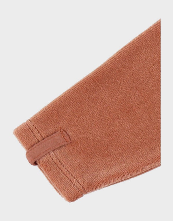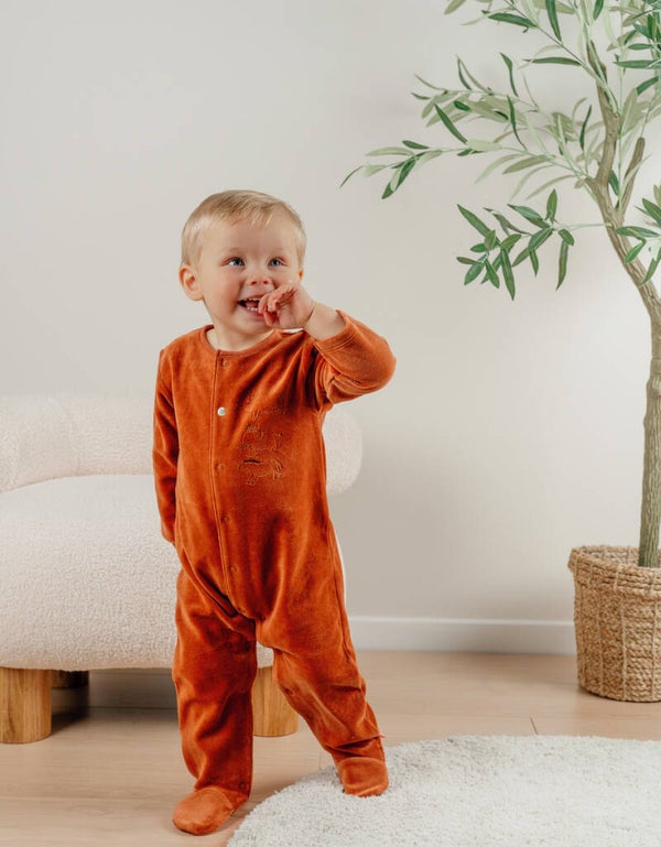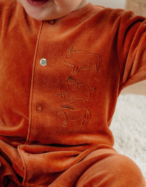 Ce pyjama dors-bien en velours couleur rouille apporte chaleur et originalité à l’univers de bébé. Il est sublimé par une application brodée de trois adorables animaux – un cheval, un buffle et un éléphant – pour éveiller sa curiosité en douceur. Le tout complété par une pression personnalisée arborant le joli sourire de Nouky.
