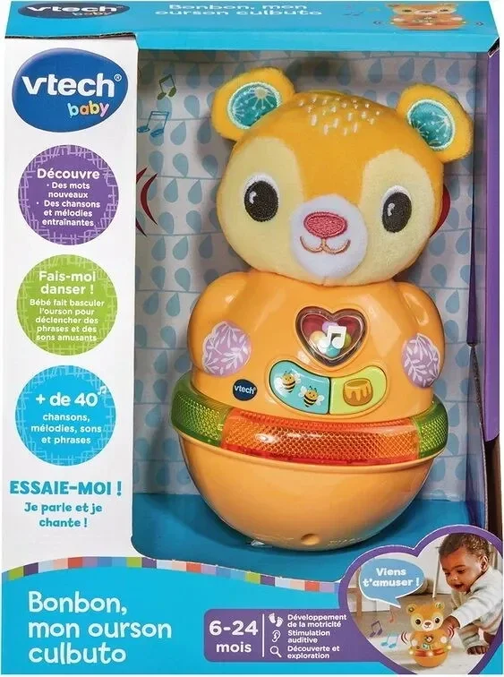 Un ourson culbuto interactif pour développer l'acuité visuelle, le langage, le toucher et la motricité fine de Bébé ! Contient 3 boutons interactifs, 3 chansons et 12 mélodies. Alim. 2 piles LR03/AAA fournies. Dès 6 mois.