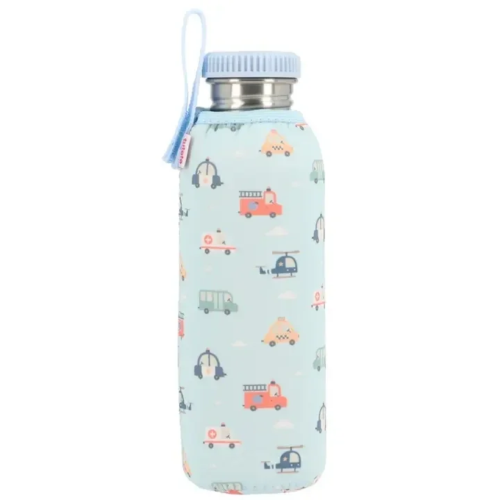 Bouteille Enfant en Acier Inoxydable avec Housse en Néoprène 750 ml de la Collection Rentrée City Cars de Tutete. L'alternative écologique et saine aux bouteilles en plastique ! La bouteille avec housse en néoprène est parfaite pour l'école, la crèche ou les promenades. Elle est conçue pour garder l'eau fraîche plus longtemps et éviter les goûts indésirables que peuvent transmettre les plastiques. Caractéristiques CE N'EST PAS UNE BOUTEILLE ISOTHERME mais la housse en néoprène aide à maintenir la température plus longtemps Composition : Acier inoxydable 304 (18/8) Dimensions : diamètre : 6