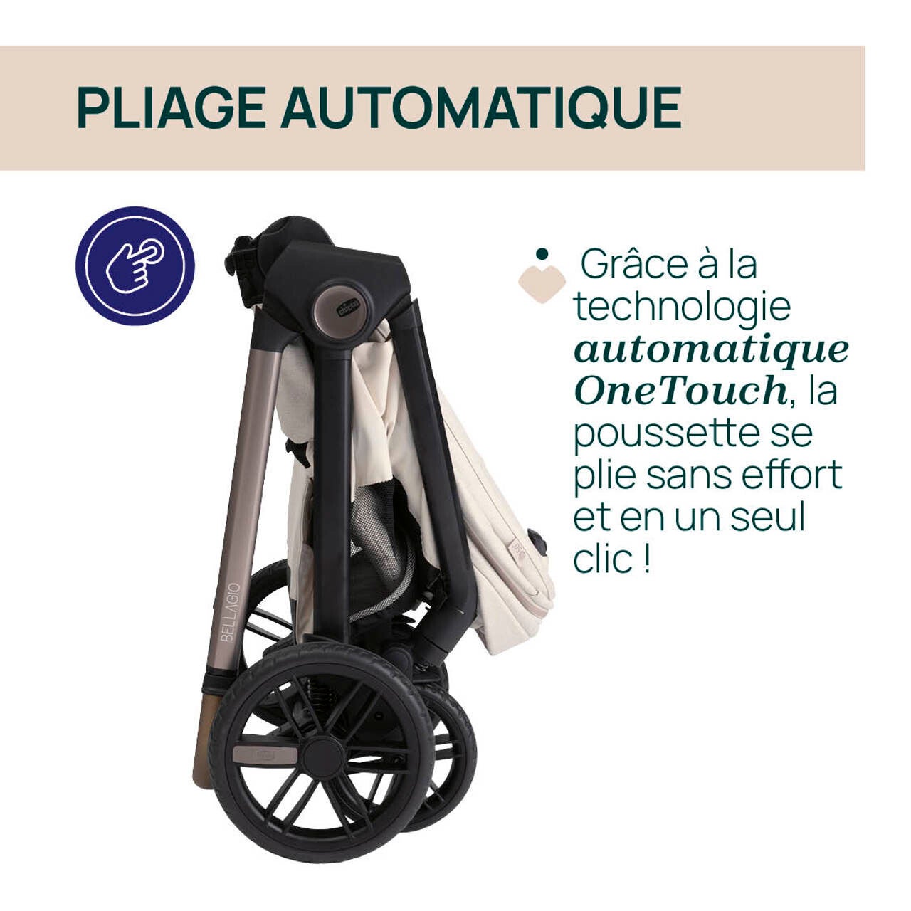 - La poussette Bellagio vous permet de tout gérer sans effort, et d'un seul geste. Grâce à la technologie automatique One Touch, elle se plie en un seul clic ! Une fois pliée, elle tient debout seule et dispose d'une poignée de transport pratique.