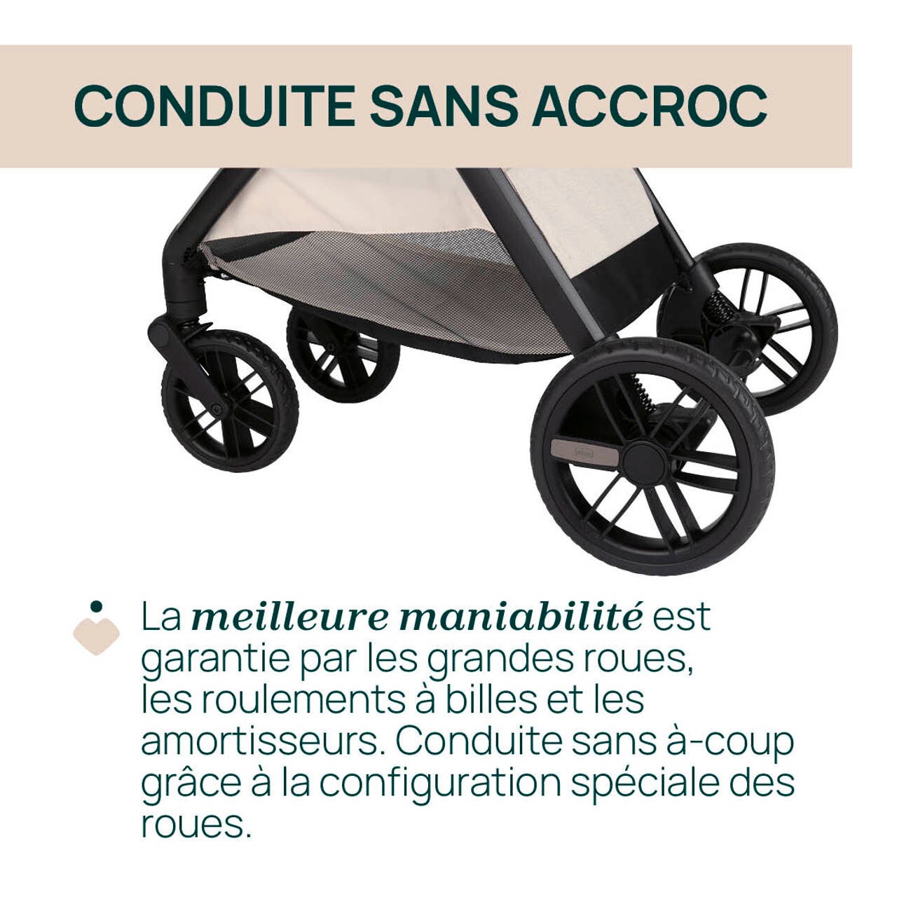 - Meilleure maniabilité est garantie par des grandes roues performantes, des amortisseurs et des roulements à billes également présents sur le système de pivotement. La configuration spéciale des roues garantit des promenades stables sur tous les terrains.