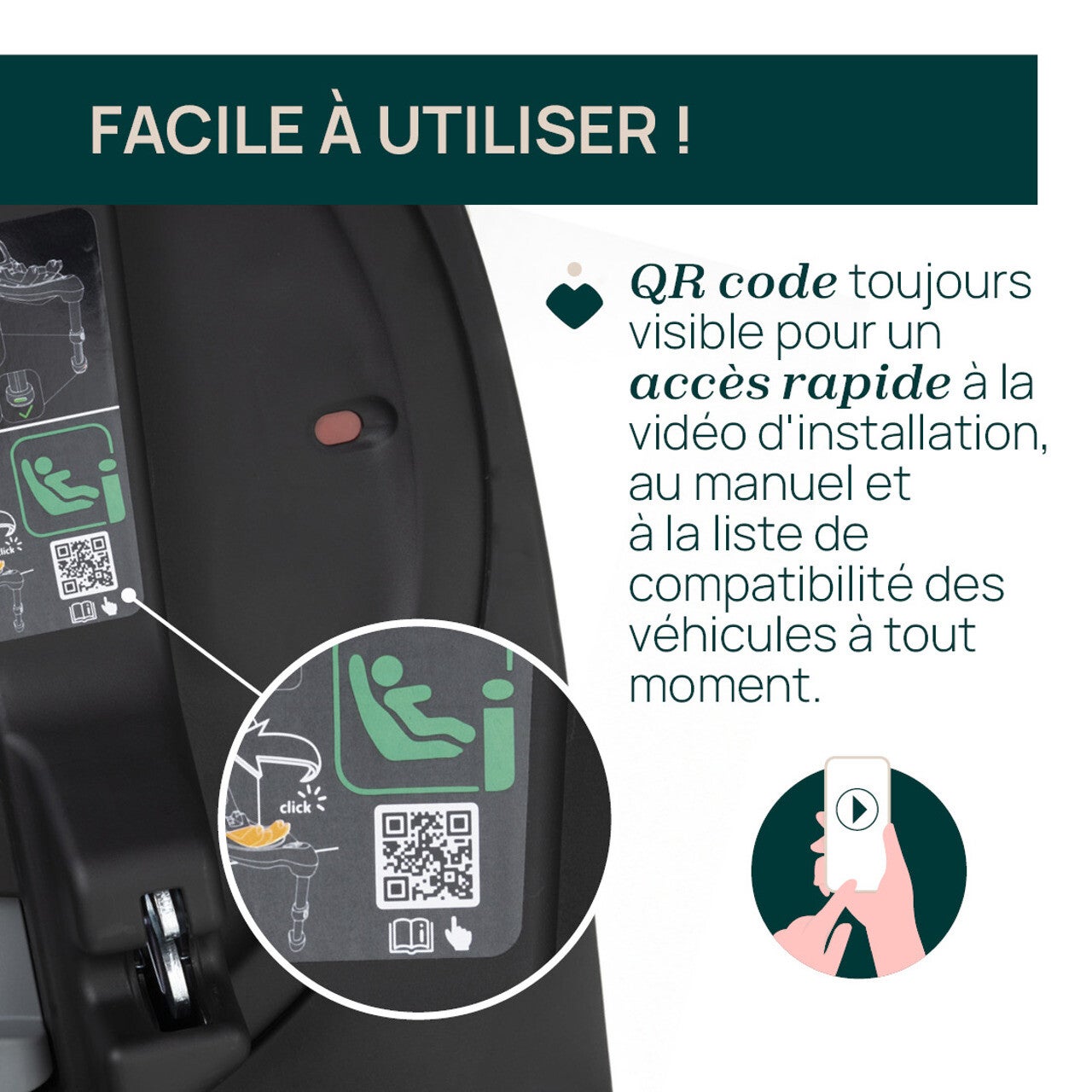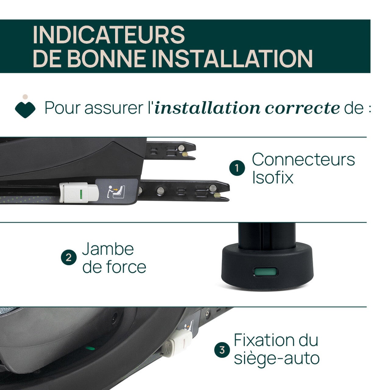 - La base est équipée de connecteurs Isofix et d'une jambe de force pour une installation rapide et sûre. Rotation de 360° pour placer facilement le bébé et passer rapidement de la position dos à la route à la position face à la route.
