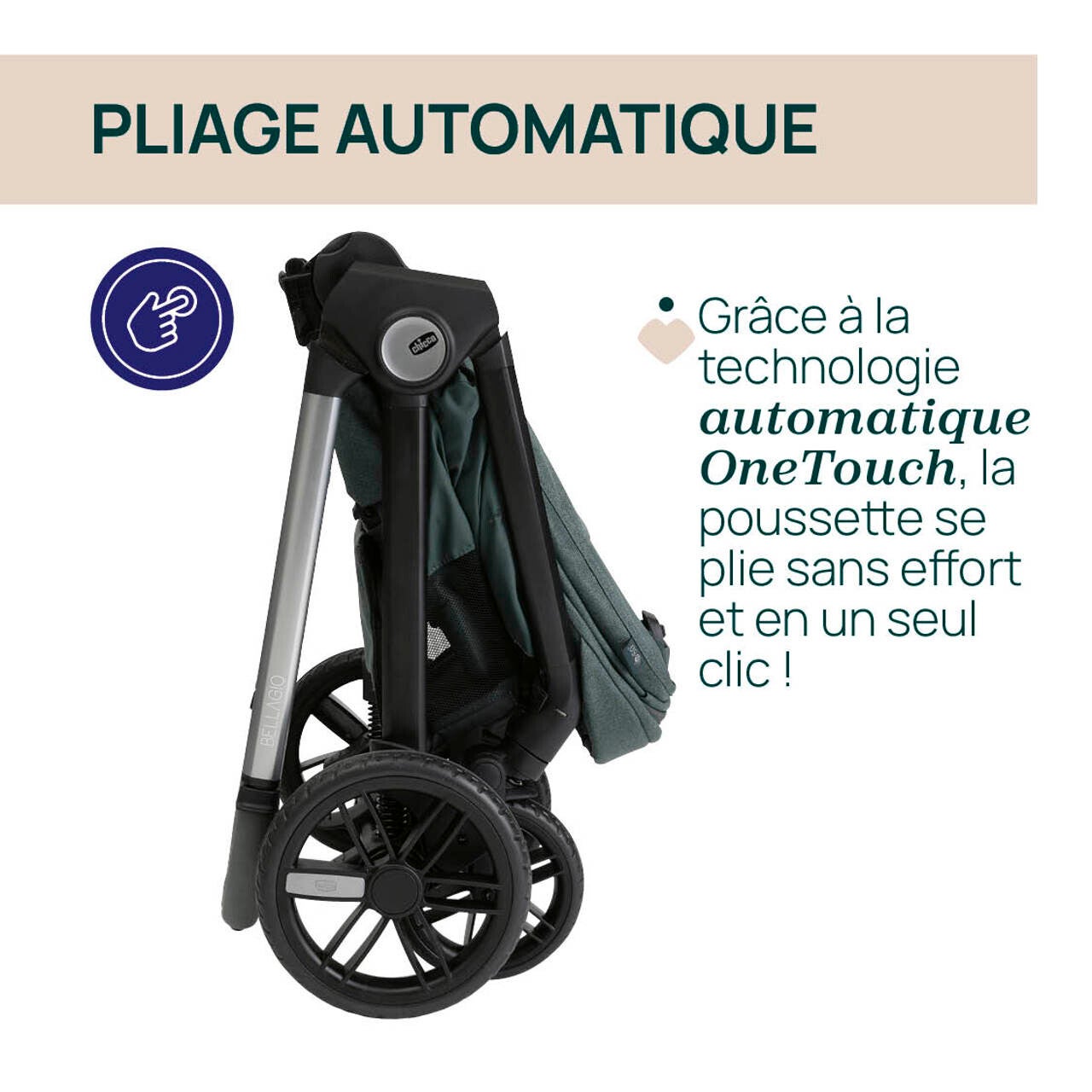- La poussette Bellagio vous permet de tout gérer sans effort, et d'un seul geste. Grâce à la technologie automatique One Touch, elle se plie en un seul clic ! Une fois pliée, elle tient debout seule et dispose d'une poignée de transport pratique.