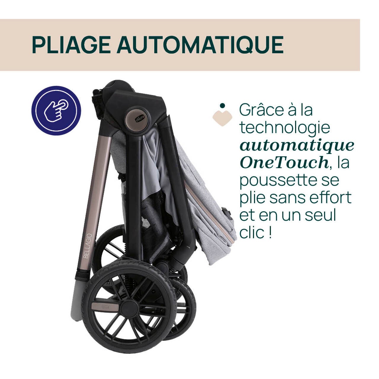 - La poussette Bellagio vous permet de tout gérer sans effort, d'un seul geste. Grâce à la technologie automatique One Touch, elle se plie d’un seul clic ! Une fois pliée, elle tient debout seule et est dotée d'une poignée de transport pratique.