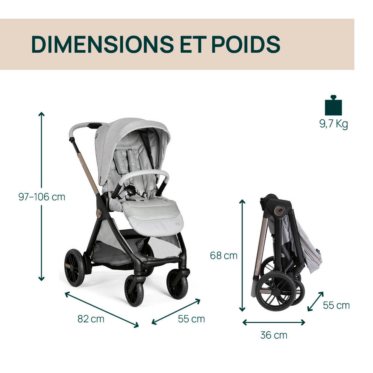 - Transformez la poussette Bellagio en un système de voyage complet avec la nacelle Flexi et les sièges auto First-Seat Recline ou Kory. Accessoires inclus : adaptateurs, housse de pluie. Le rabat de la nacelle peut servir de couvre-jambes sur la poussette.
