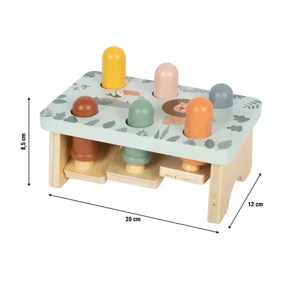 Du plaisir à tapoter les animaux pour les petits explorateurs ! Ce jeu de tapotement conçu avec amour en bois certifié FSC® 100 % au look safari invite les enfants à utiliser un marteau pour faire tomber les bâtons en bois qui dépassent du banc de tapotement - avec un effet de surprise : si un bâton est enfoncé, le bâton opposé dépasse encore plus. Une expérience de jeu qui favorise la vitesse de réaction, la motricité et la coordination – et qui, grâce à son design moderne, constitue également un accroche-regard décoratif dans la chambre de l'enfant. Les motifs animaux conçus avec amour et la palette de couleurs moderne stimulent l'imagination et la créativité des enfants, tandis que les tiges en bois mobiles illustrent le principe de cause à effet et invitent au jeu et à l'émerveillement. Le bois robuste, le marteau facile à saisir pour les enfants et la forte proportion de bois naturel font de ce jouet un compagnon durable qui allie parfaitement apprentissage ludique et plaisir.Voir plus