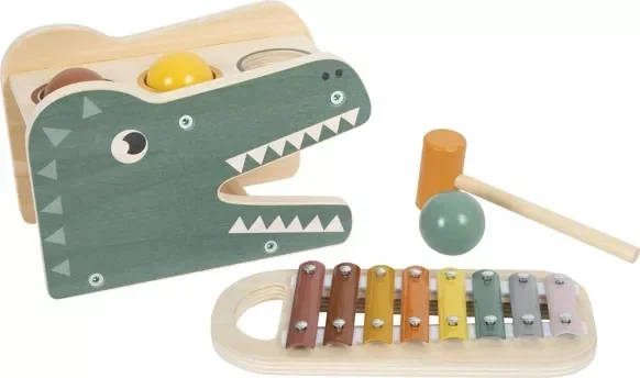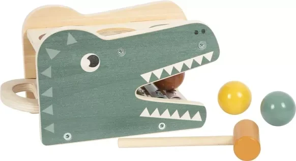Frapper et sonner du plaisir pour les plus petits ! Ce joli crocodile en bois robuste est deux fois plus amusant qu'un jeu de frappe avec xylophone intégré. Les trois boules en bois peuvent être frappées à travers les ouvertures sur le dessus à l'aide du marteau et produisent des sons excitants sur le xylophone en dessous lorsqu'elles roulent. Un point fort : le xylophone adapté aux enfants avec des barres de couleur peut être retiré du côté du jeu de frappe et joué séparément.Voir plus