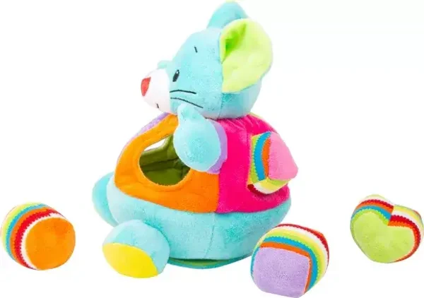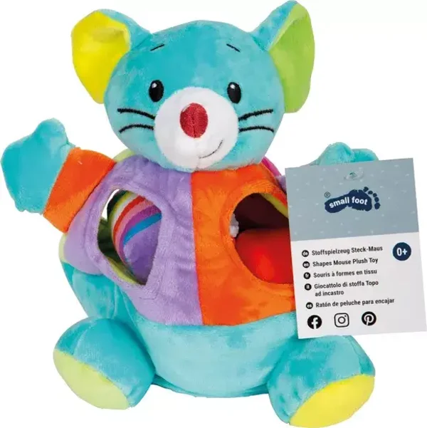 Une souris vous invite à la découverte ! Avec cette souris en peluche colorée, les petits enfants entraînent leur motricité et leur pensée spatiale. Les différentes formes géométriques en peluche doivent non seulement être attribuées, mais elles fascinent également par leur fonction de grincement, de cliquetis et de crépitement. Lorsque la souris est retournée, les petits explorateurs peuvent se regarder dans le miroir. Un hochet attaché à l'élastique offre un plaisir supplémentaire avec deux anneaux. Après avoir joué, tous les ustensiles sont remis dans la souris. Un joli jouet à moteur !