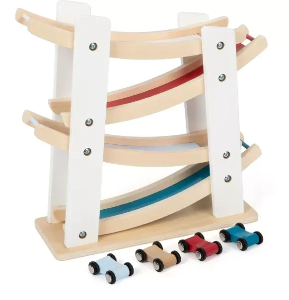 A vos marques, prêts, départ ! Ce circuit clic-clac en bois avec une base stable promet une action rapide lorsque les quatre petites voitures en bois dévalent les rampes. Au cours de leur voyage d'étage en étage, ils font des sauts périlleux amusants et s'amusent beaucoup. Le laqué blanc et le bois naturel, associés aux couleurs classiques des rampes, font de ce rail un accroche-regard qui se fond discrètement dans chaque chambre d'enfant. Favorise la motricité ainsi que la coordination œil-main et évite l'ennui dans la chambre des enfants ! Rangé sur l'étagère de la chambre d'enfant, l'hippodrome s'intègre parfaitement dans n'importe quel design de pièce, car le bois naturel et le bois laqué blanc dominent l'aspect, sans que les enfants n'aient à renoncer aux hippodromes colorés lorsqu'ils jouent.