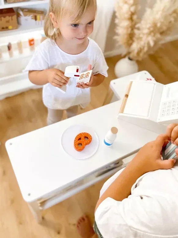 Une caisse en bois unique et optiquement moderne qui rend les courses à l'épicerie encore plus réalistes avec de nombreux accessoires et de nombreuses fonctions ! Equipée d'un scanner manuel, d'un rouleau de reçus papier, d'un écran, d'une surface de numérisation adhésive, de cartes d'argent et de produits ainsi que de pièces en bois imprimées des deux côtés, cette caisse enregistreuse ne laisse rien à désirer. Les points forts sont la véritable calculatrice de poche intégrée au moniteur et le compartiment de caisse en deux parties, qui peut être ouvert vers le haut comme une vraie caisse de supermarché. Incl. stylo effaçable avec éponge intégrée pour signer sur la surface en verre acrylique. Piles non incluses. Passer à la caisse comme au supermarché ? Alors cette caisse enregistreuse de la gamme de produits « frais » ne devrait pas manquer dans une épicerie bien approvisionnée ! La surface de numérisation adhésive peut facilement être collée sur un magasin existant ou une autre surface de jeu. Les trains de collecte ludiques manipulant des sommes d'argent et des prix ainsi que les 15 pièces sont conçus de telle manière qu'ils peuvent être utilisés pour pratiquer les premières opérations arithmétiques. Les 5 cartes alimentaires imprimées recto-verso favorisent également l'apprentissage du comptage et du calcul. Si vous préférez taper pour calculer, vous pouvez facilement saisir les prix des produits achetés à l'aide du clavier de la véritable calculatrice de poche intégrée. La finition de haute qualité avec du bois robuste et du verre acrylique fait de la caisse enregistreuse un véritable accroche-regard dans la chambre des enfants, qui promet un plaisir durable !