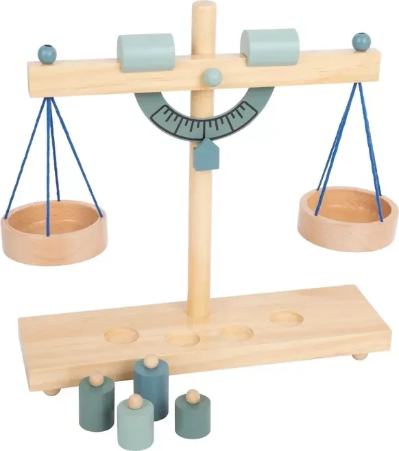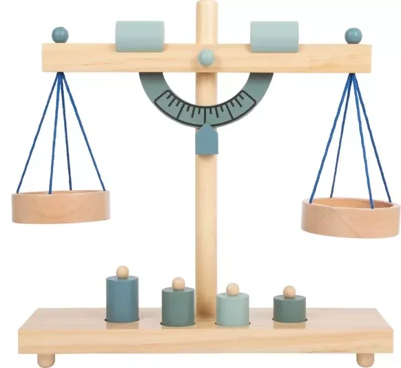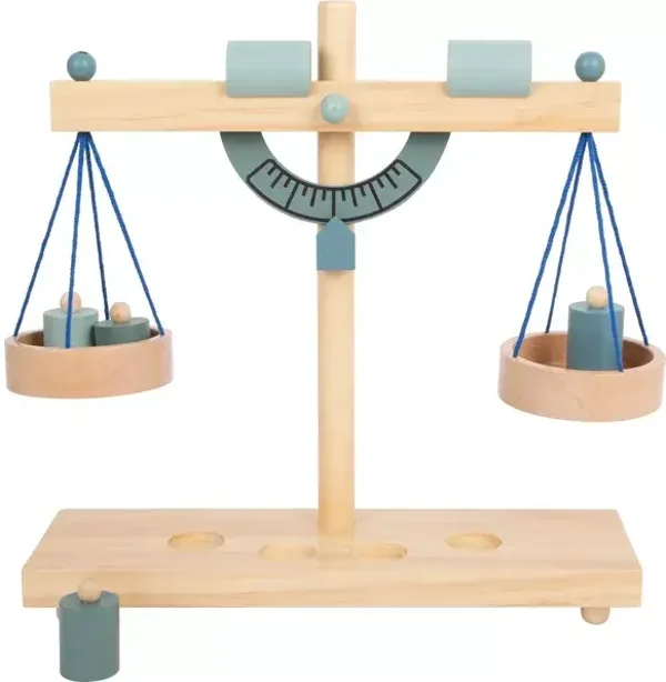 Pesez comme au marché hebdomadaire ! Avec cette balance en bois robuste, les petits commerçants disposent de l'outil adéquat lorsqu'ils pèsent les courses de leurs clients au supermarché ou au marché des enfants. Quatre poids différents aident à déterminer le poids et deux poids d'équilibrage réglables sont utilisés pour ajuster la balance. Cela donne aux enfants une sensation ludique de poids et d’équilibre. Lorsqu'on sert les clients à l'épicerie, les compétences sociales sont développées et les jeux de rôle actifs sont encouragés. Ce coffret de jeu ne devrait donc pas manquer dans la boutique !