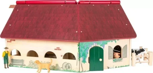 Muhhh - la vie à la ferme en classe ! Ce grand univers de jeu en bois certifié FSC® 100 % ne laisse rien à désirer pour les petits agriculteurs. Le charme particulier : La construction stable en bois de la ferme est disposée selon une forme angulaire frappante et équipée d'un toit à charnières. De cette façon, la ferme peut être utilisée très confortablement. Les animaux adaptés aux enfants font briller les yeux des enfants. La vache tachetée de noir et blanc et le cochon rose trouvent leur place douillette dans deux box de la grange équipés de portes coulissantes. Le chien de cour garde les yeux ouverts et le fermier regarde dans le grenier à foin pour s'assurer que tout va bien. Avec le bloc et le palan mobiles, il continue d'ajouter de nouvelles bottes de foin et de paille. De cette façon, tous les animaux sont assurés d'être nourris. La conception détaillée de la ferme encourage un jeu réaliste : il n'y a pas de limites à l'imagination. Les portes divisées de la ferme offrent suffisamment d'espace pour que le tracteur (article 11006) puisse facilement passer pour se garer. Pour les petits explorateurs, il y a de nombreux détails peints en filigrane autour de la cour à découvrir, comme des fleurs, un banc, un arrosoir, un nid d'oiseau et même une souris. Presque comme dans la vraie ferme ! Chien, vache, cochon, fermier et balle de foin sont inclus.