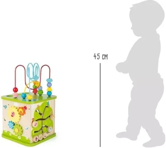Le monde du jeu pour les plus petits est grand ! De nombreuses idées de jeu géniales sont ici combinées dans un cube en bois robuste - en plus des formes enfichables et des attaches en fil métallique, un parcours de billes, un jeu de coordination pour l'apprentissage des chiffres et un mur à crémaillère sont intégrés. L'ensemble entraîne intensivement la motricité, la compréhension des formes, des couleurs et de la physique - et enfin, le plaisir de vivre une vie colorée. Les blocs et les balles placés dans le cube peuvent être récupérés via une petite porte au sol - et vous pouvez tout recommencer. Ce cube de motricité est un outil polyvalent idéal pour les petits explorateurs actifs qui souhaitent découvrir leur monde.