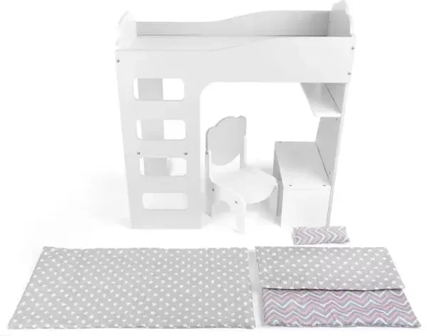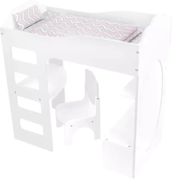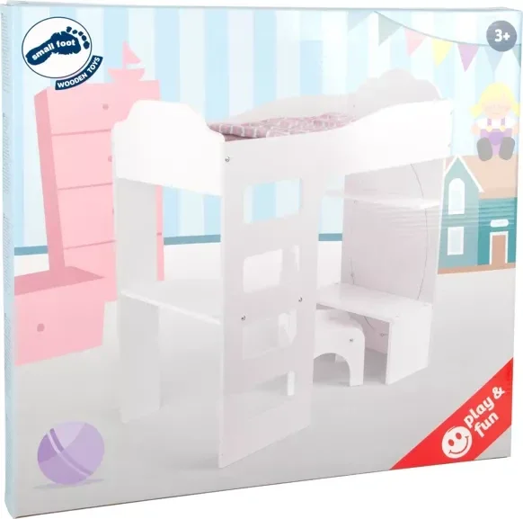 Un rêve pour chaque poupée ! Ce lit mezzanine en bois avec miroir, linge de lit coloré, échelle intégrée et étagères pratiques offre des possibilités de jeu optimales et un fabuleux espace de rangement. Le point fort : sous le lit superposé se trouve un bureau avec une jolie chaise de poupée. Ce lit mezzanine fait battre plus vite les cœurs de poupées et offre la possibilité de s'essayer à des jeux de rôle de manière ludique.