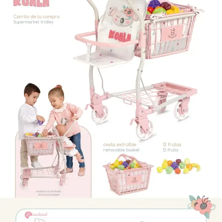 Chariot de supermarché avec logo en tissu polaire et transfert KOALA. Panier amovible doublé de tissu qui comprend un ensemble de 12 fruits. Il comprend un porte-bébé dont la taille maximale de poignet recommandée est de 48 cm.