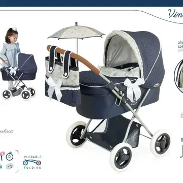 Avec sac, parapluie et plateau de rangement. Tissu matelassé. Il comprend également un matelas et un oreiller. LA TAILLE INTÉRIEURE DE LA NACELLE EST : 48 x 26 cm. Le châssis est pliable.