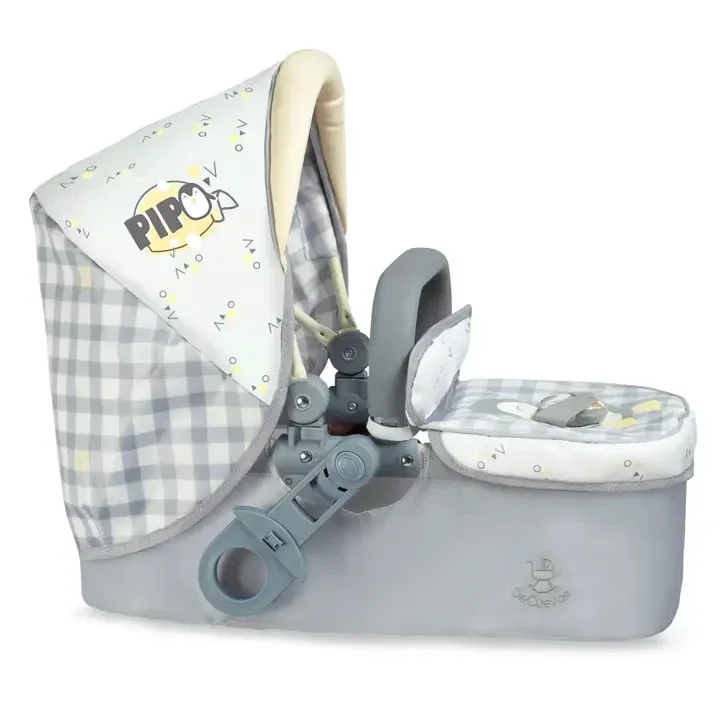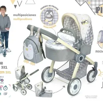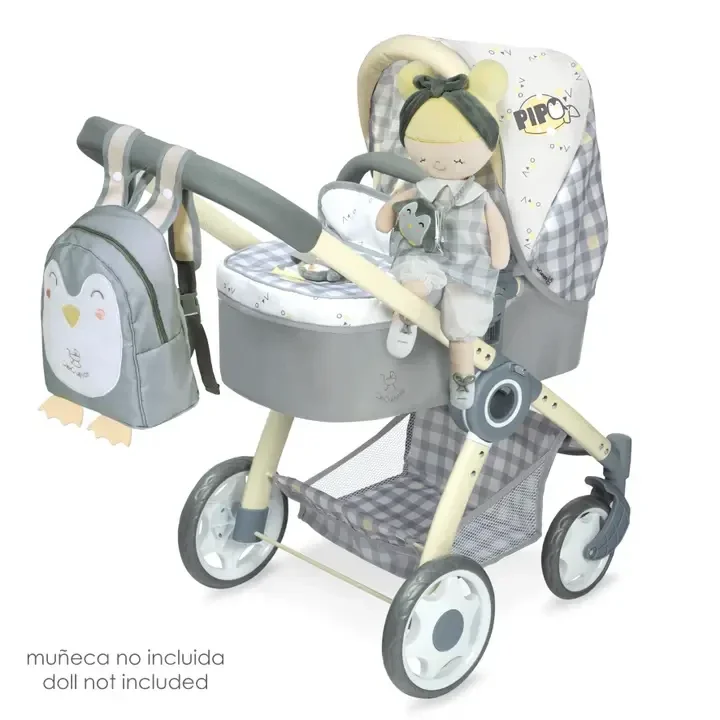 Voiture de poupée pliable 3x1 (voiture+chaise+voiture+nacelle). Les roues avant sont pivotantes et comprennent une ceinture de sécurité de type harnais, un sac à dos, un plateau de rangement, et la housse de la nacelle comprend un joli transfert qui enveloppe un bébé pingouin en peluche. DIMENSIONS DE LA NACELLE INTÉRIEURE : 46 x 24 cm.